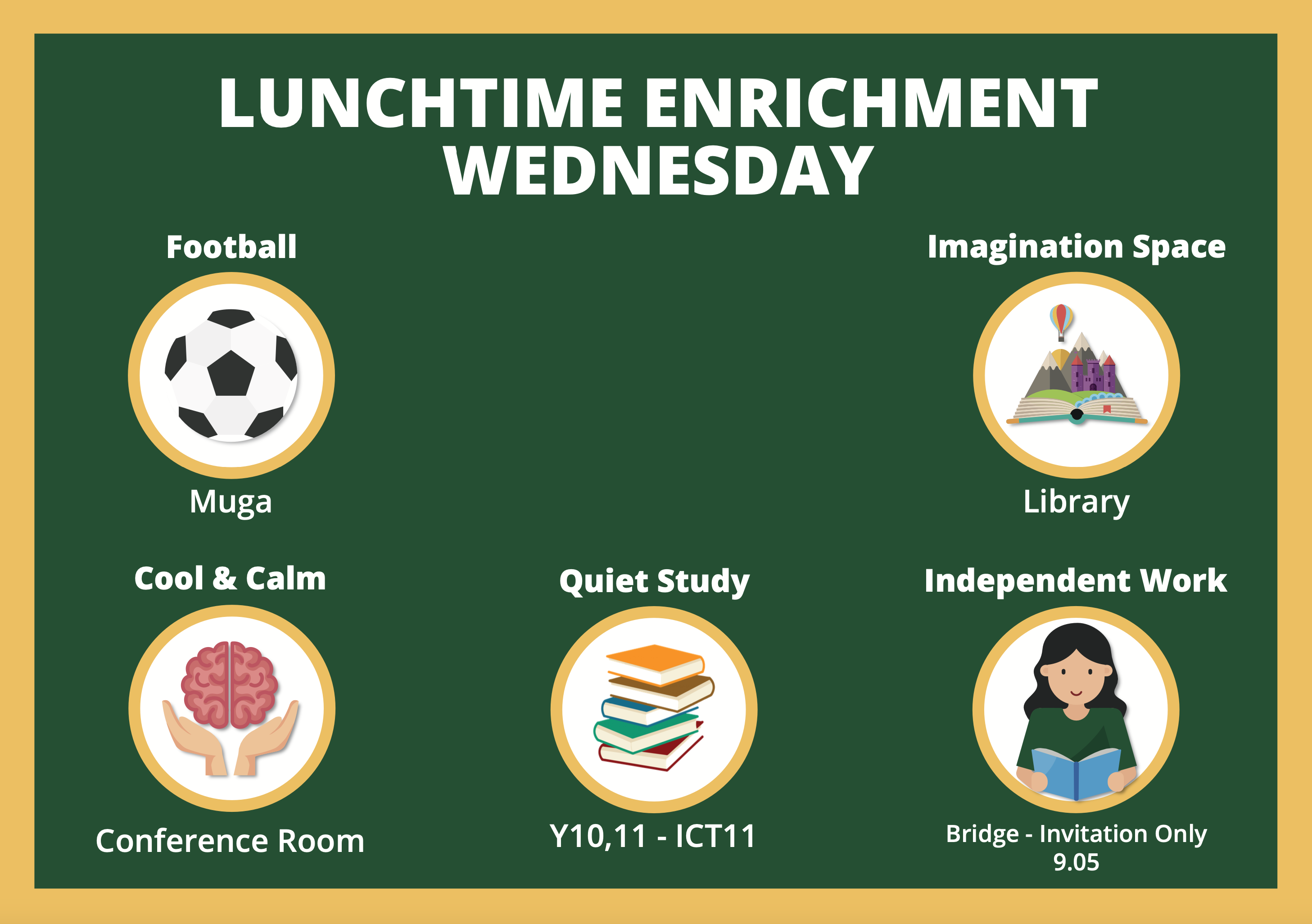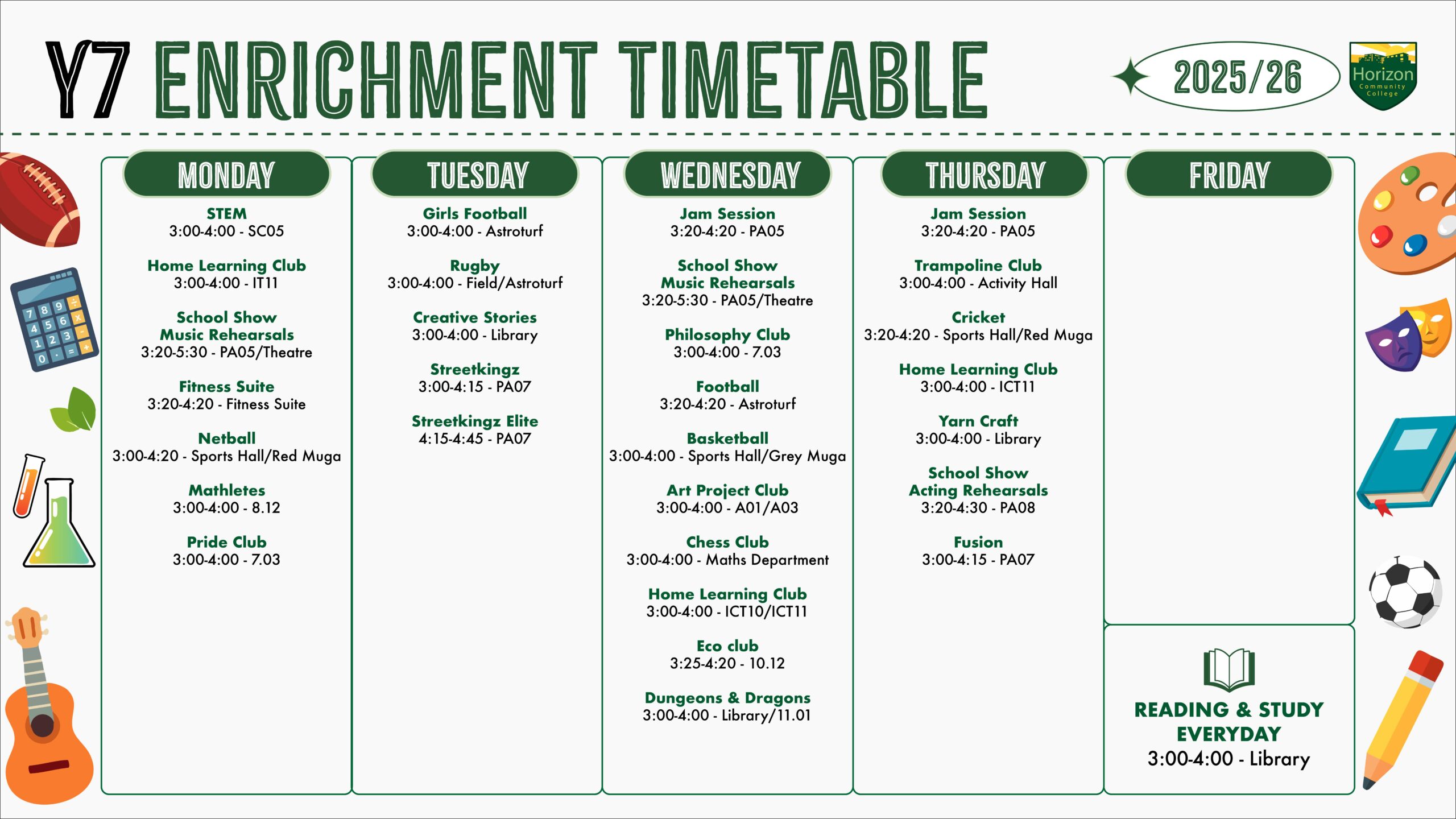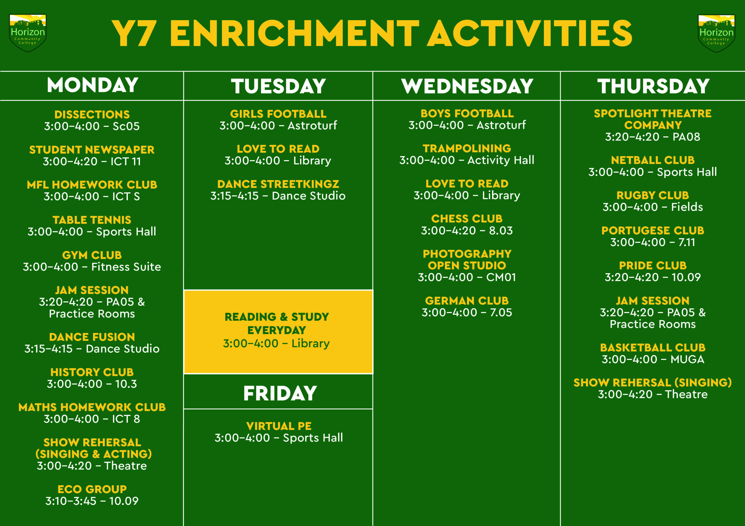 For further information regarding the clubs and enrichment activities, please ask your child to see their subject teacher.