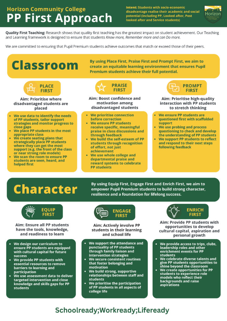 At Horizon, the Pupil Premium First strategy sets out how teachers, leaders and support staff work together to ensure that all students eligible for Pupil Premium funding can access academic, pastoral, careers and enrichment support in and out of the classroom. Our PP First Approach is outlined below: